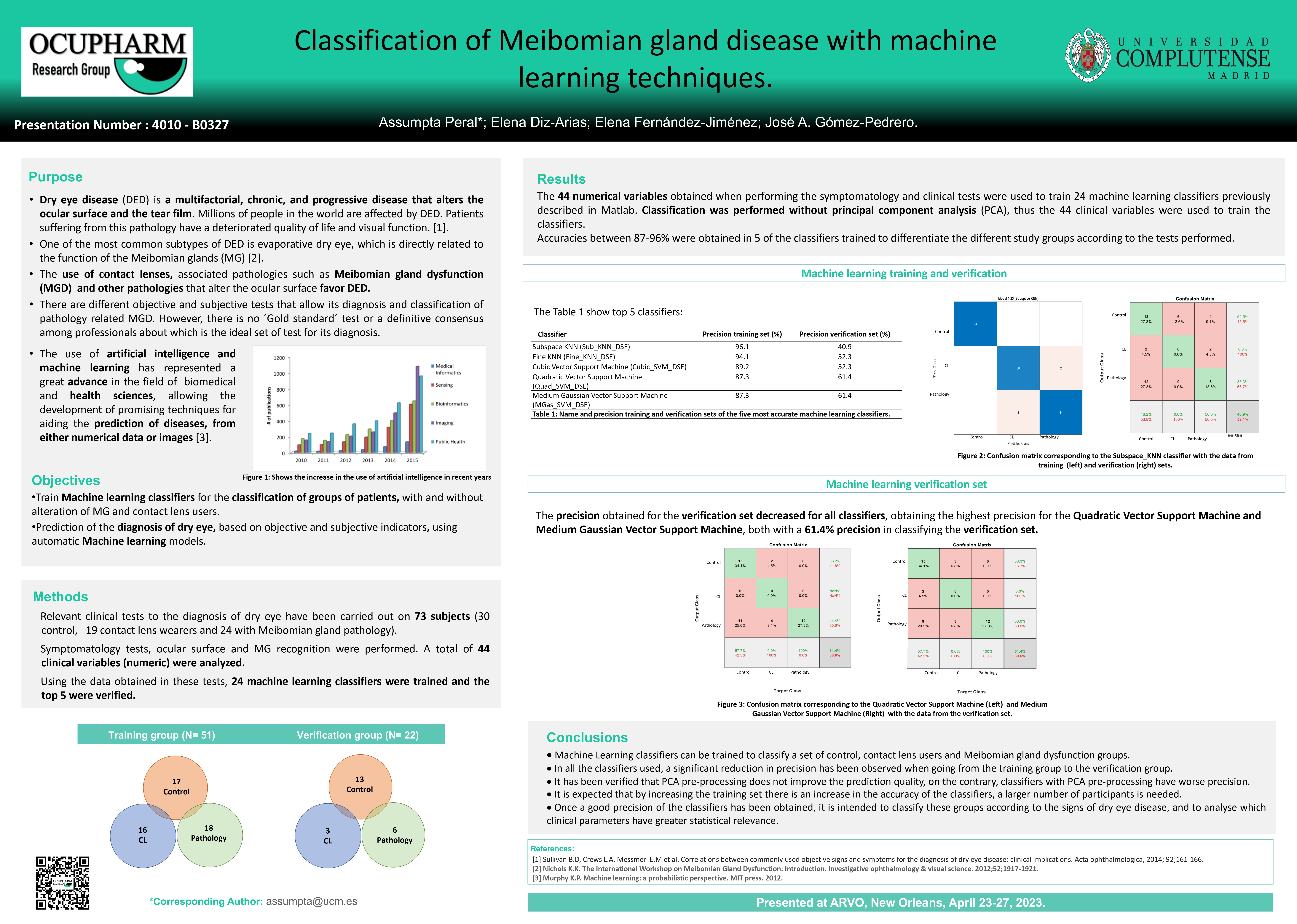 Una representación del grupo de investigación estuvo allí presentando los resultados de sus investigaciones. El trabajo Classification of Meibomian gland disease with machine learning techniques realizado por Assumpta Peral, et al., fue Hot Topic en el congreso! Los autores presentaron sus resultados en los que concluyen que se pueden entrenar clasificadores de aprendizaje automático para clasificar la disfunción de las glándulas de Meibomio. Observaron que en todos los clasificadores hubo una reducción de la precisión al pasar del grupo de entrenamiento al grupo de verificación. La investigación en este área y la mejora de la precisión de los clasificadores, ayudará en el futuro a clasificar en función de los signos de la enfermedad del ojo seco, y analizar qué parámetros clínicos tienen mayor relevancia.