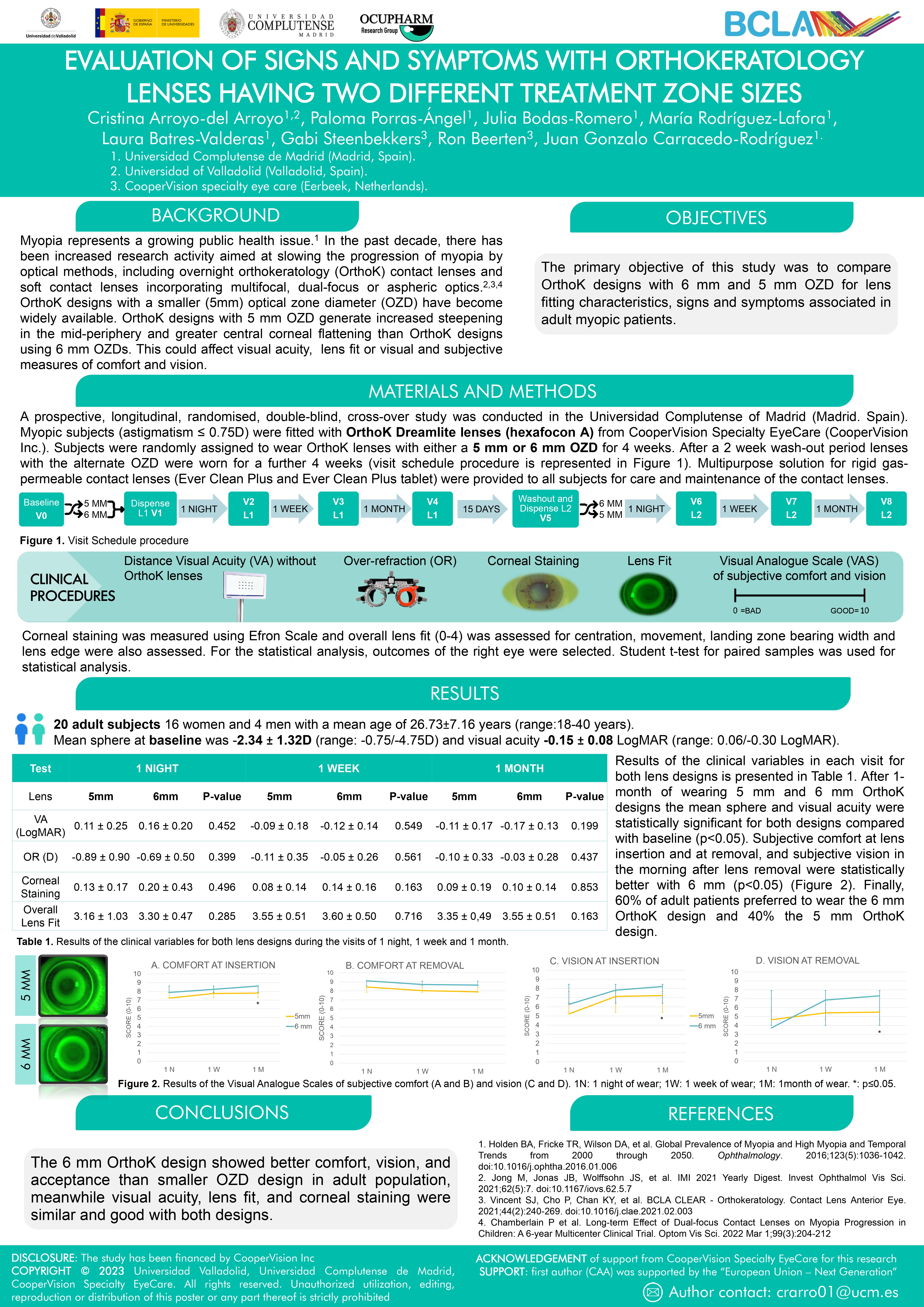 Laura Batres et al., presentaron Accommodation response and spherical aberration during orthokeratology wearing: 1 year follow up and recovery , en el cual se evaluaban los cambios en un año de la aberración esférica y la respuesta acomodativa de un año de tratamiento de ortoqueratología en niños y adolescentes miopes.